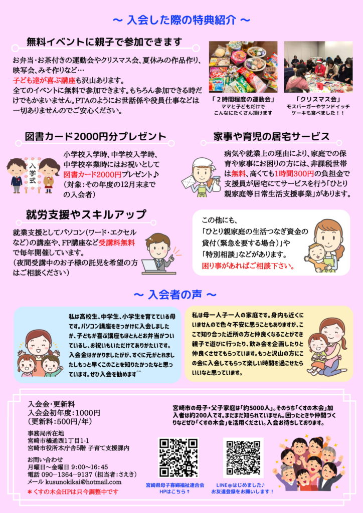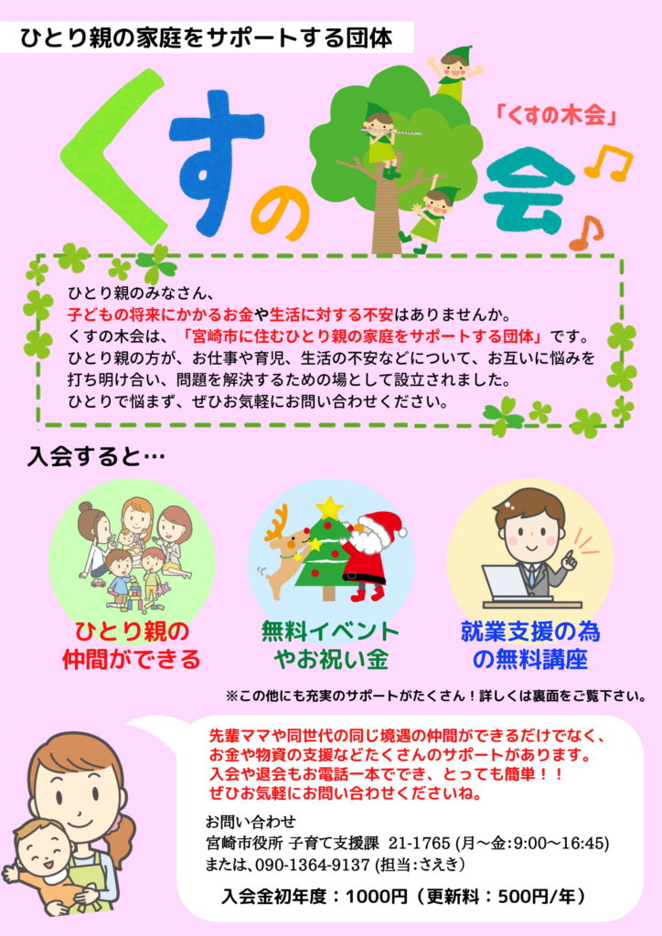 母子会改め父子のためでもあるのでくすの木会に変更された宮崎市。若い世代に知ってもらうためにもチラシをプチ・コパンで作らせていただきました。母子部長も行っている松田ですがまちの居場所「たいよう」でも入会手続きできますのでオープン時は気軽にお声かけください。